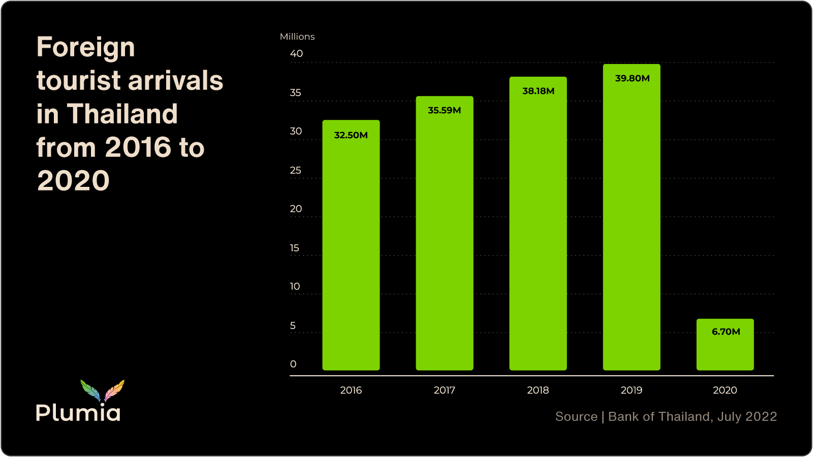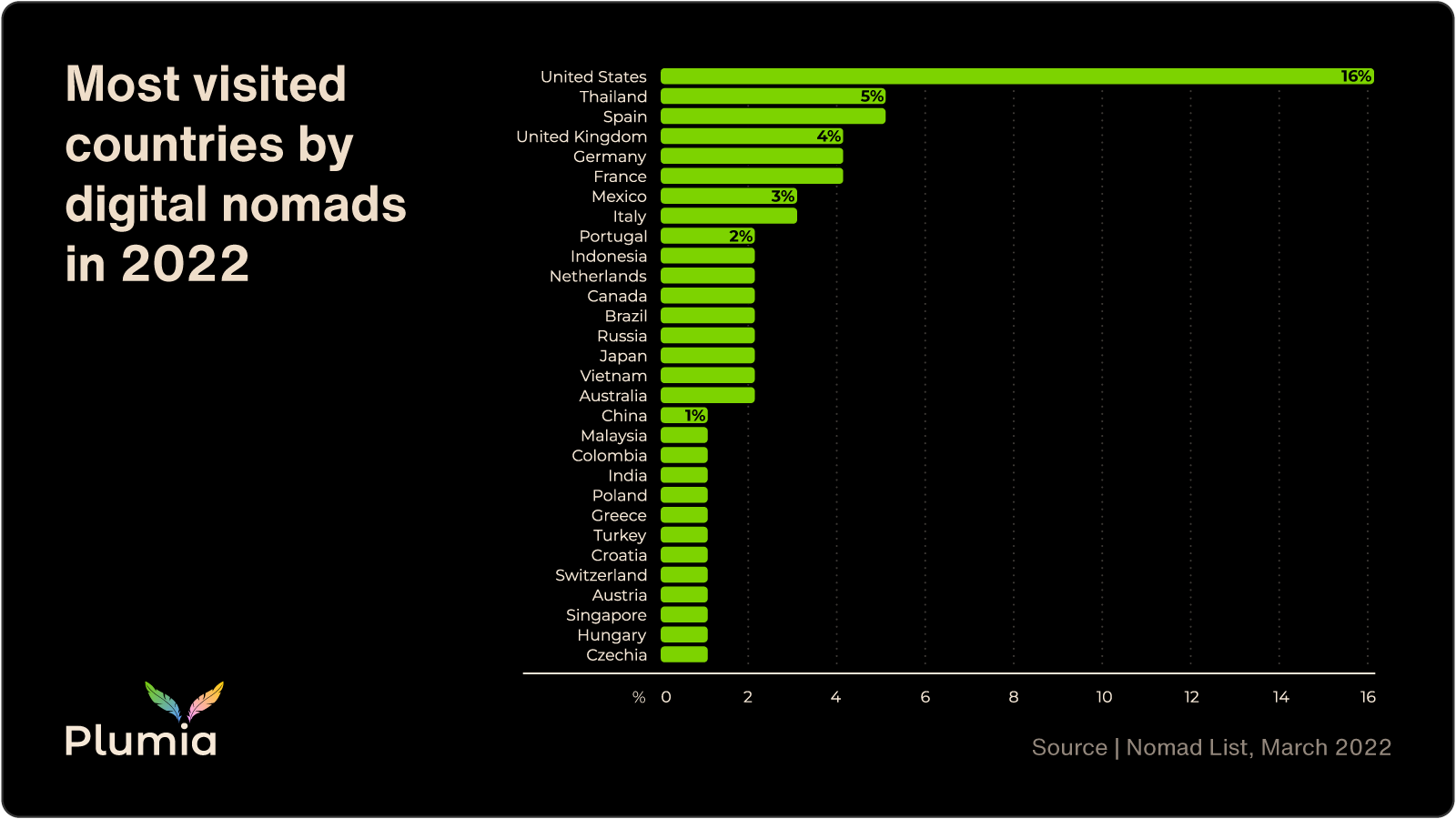 The Plumia team applied these estimates to Thailand, which is home to two of the top five nomad hotspots, to assess the potential economic impact of nomads in the country. Let's say the average nomad spends 35% of their income, equating to $2,479 per month or $19,832 during their typical eight-month stay in Thailand. In 2019, Thailand welcomed nearly 40 million international tourists. If just one million of those visitors were nomads, this would have equaled an economic contribution of $19.8 billion. The GDP of Thailand was $544 billion that year, which means that the expenditure of one million nomads over one year could account for as much as 3.6% of Thailand’s GDP.