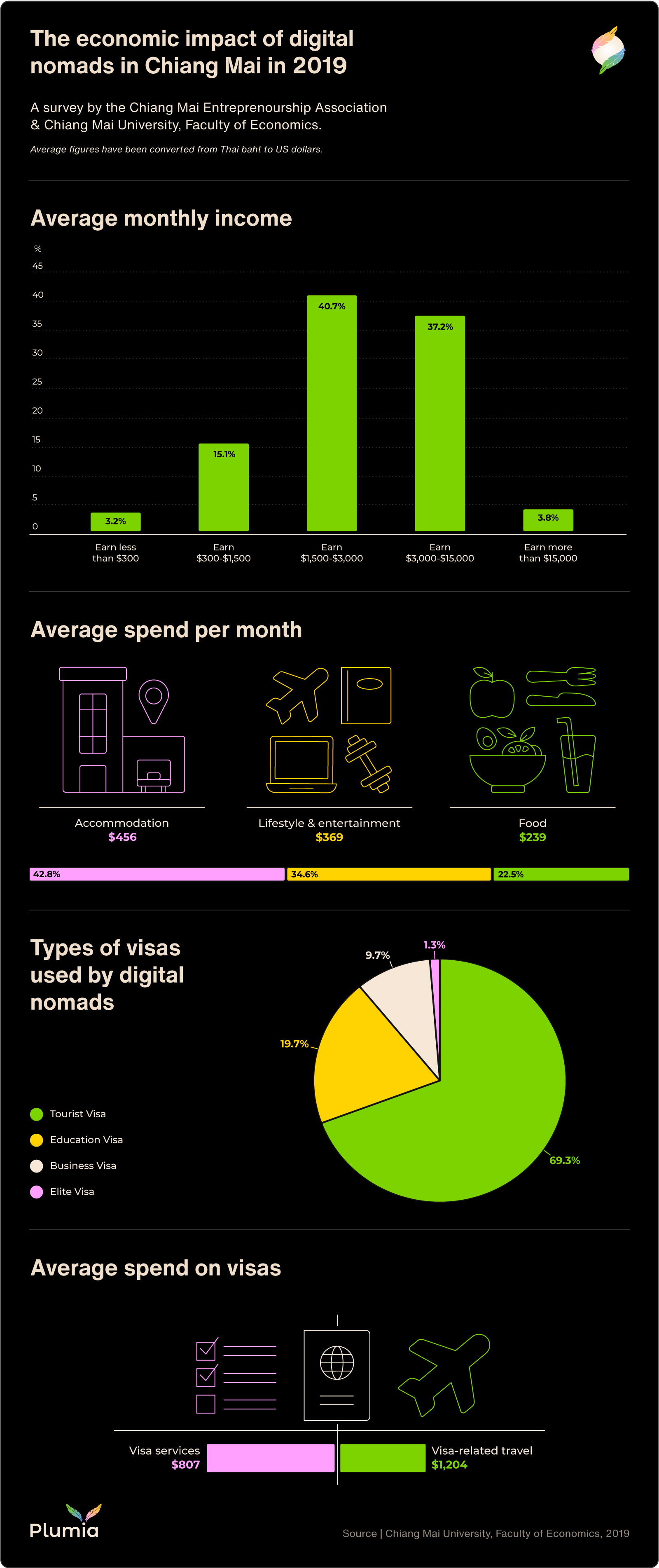 Most nomads (86.8%) surveyed were traveling in Thailand on a tourist visa, showing that most nomads in Chiang Mai are still defined as leisure tourists rather than as nomads or remote workers. The study also found that 40% of the Chiang Mai nomads surveyed earned between $1,380 and $13,830 per month, with an average income of around $7,600 per month.